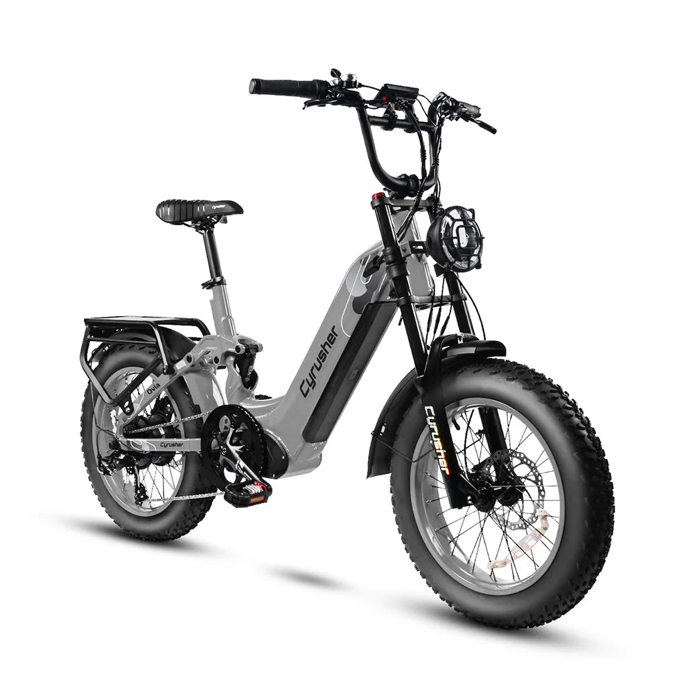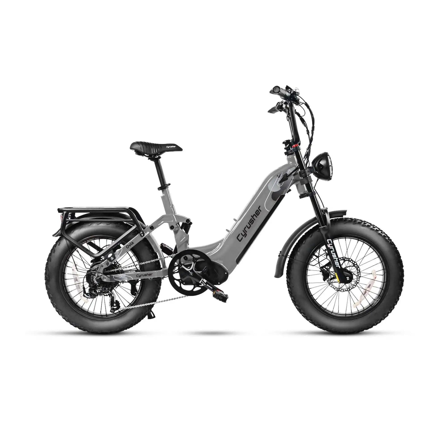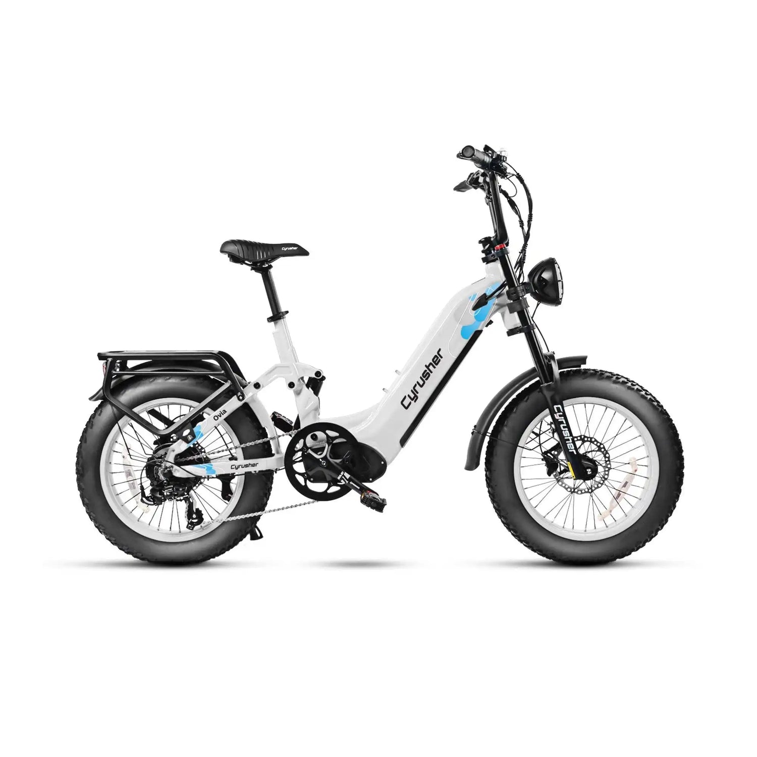 Cyrusher's latest step-through electric bike is simply gorgeous! Not only is it more convenient to get on and off the bike due to its lower frame, but its motorcycle-style front fork and lamp-style front light give it an aggressive look. While the frame shape, minimalist paintwork design, and its colored rims give it a gorgeous look. Don't be fooled by its size. This bike comes with all the goodies of its big brothers: a powerful Bafang motor, a larger capacity 17Ah battery and fat tires, plus rear air suspension, and a new color LCD screen.
