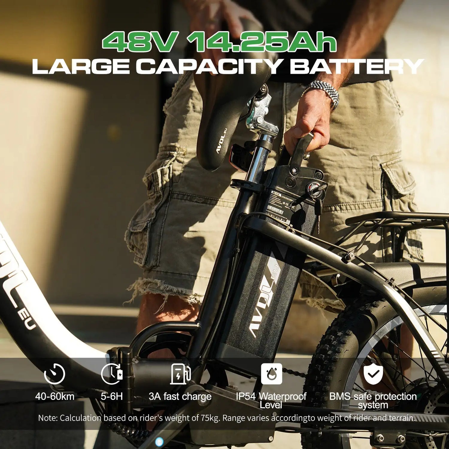 AVDLEU foldable electric bike A21. AVDLEU foldable electric bike, 20 off-road E-bike with 3.0 Fat tire, electric bike 250W - 25km/h, E-bike 48V/14.25Ah Large battery 50-100km (Mode ASSIST), SHIMANO 7-Speed, adult off-road electric bike