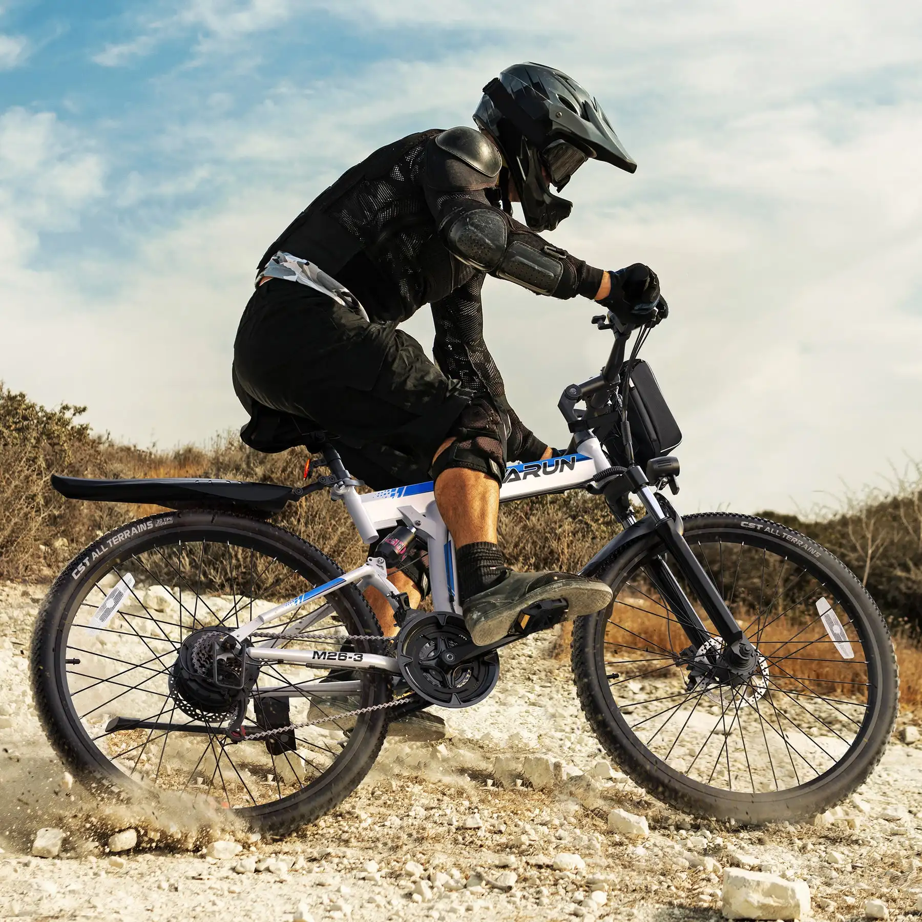 Get ready to embark on an amazing outdoor adventure! The VARUN M26 Storm electric mountain bike is the perfect blend of adaptability and comfort! It can handle any terrain you throw at it, while still providing a smooth and comfortable ride. With an impressive 374.4Wh lithium battery capacity and a 500W high-speed brushless motor power, this bike is ready to go the distance! It can handle 50 miles of one-way riding with ease and climb any incline with its reliable grade‐climbing capability. Plus, it's equipped with 26-inch puncture‐resistant tires, a high‐strength front suspension fork, a rear spring shock absorber, and mechanical dual disc brakes for full shock absorption. This bike is ready to take you on your next adventure! You can easily ride over gravel, rain, dirt, and sand and enjoy the ultimate e‐bike adventure! With intelligent 3‐level pedal assist, 3 riding modes, and Shimano 21‐speed gear, you can freely customize your riding mode and choose any speed according to your needs. The M 26 TGBUL electric mountain bike is the ultimate in fun! It combines the performance of a mountain bike and a city bike into one, bringing more fun to cyclists and novices alike. This electric bike is perfect for any adventure, whether you're conquering real mountains or just cruising through the urban jungle!