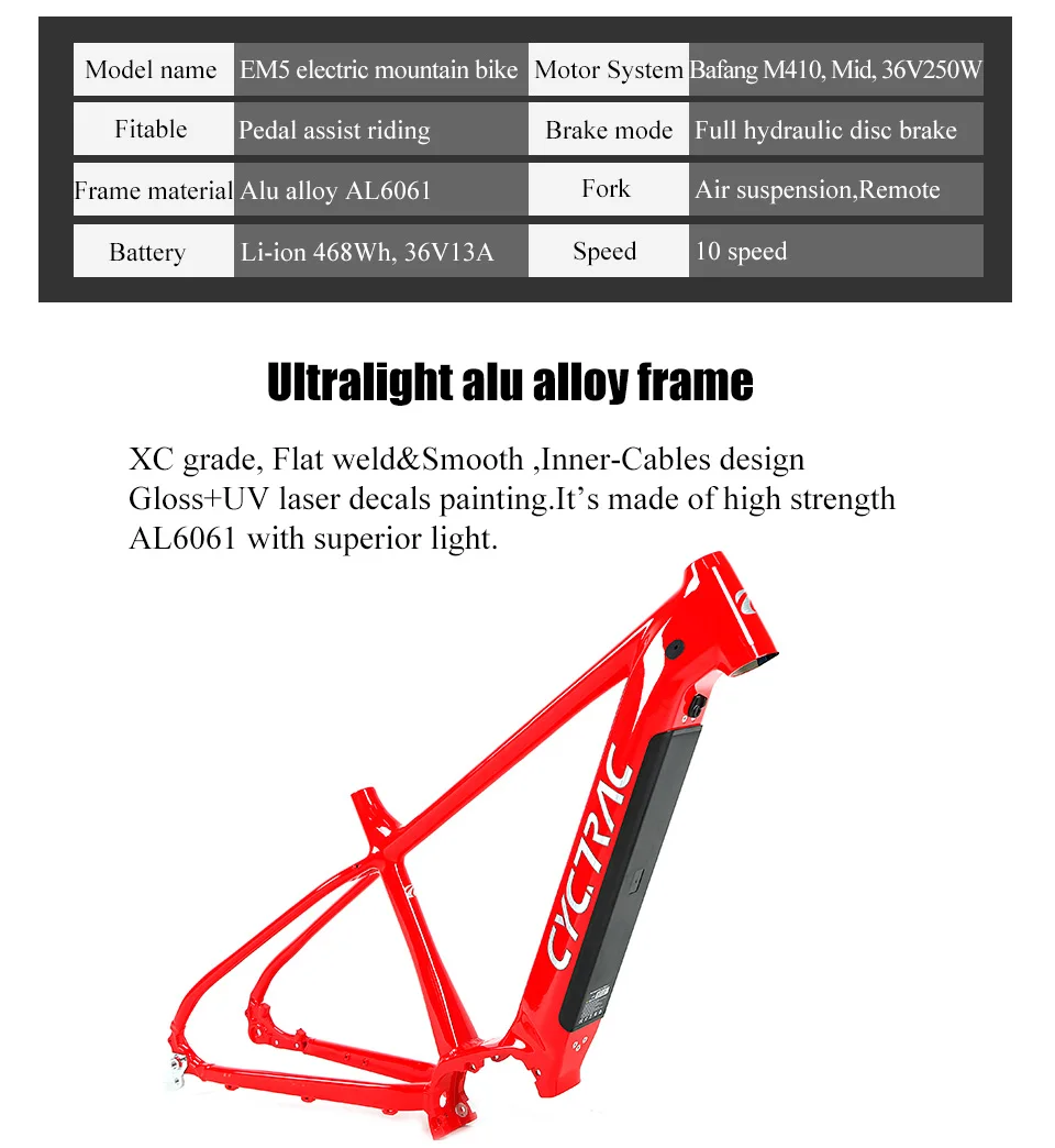 China Factory E Bike AL7005 Frame 36V250W13A Bafang Middle Motor Built-in Battery Electric Bike