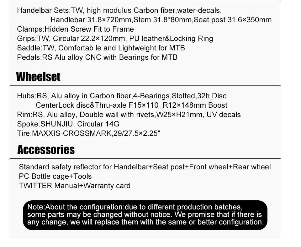 TW, high modulus Carbon fiber,water-decals,Handlebar 31.8×720mm,Stem 31.8*80mm,Seat post 31.6×350mm |