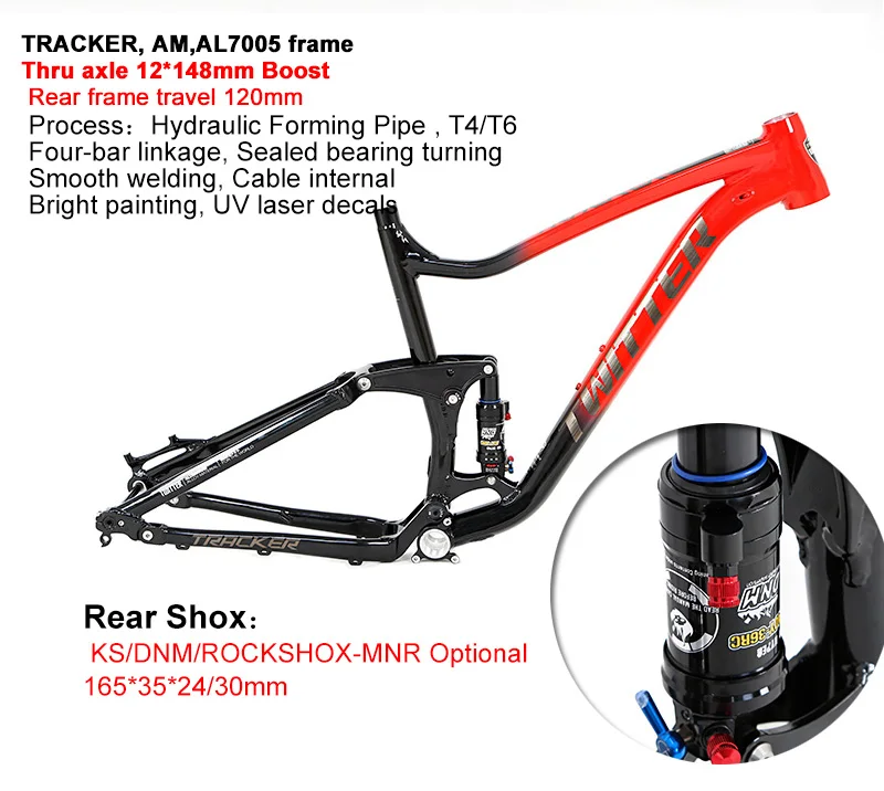 TRACKER, AM, AL7005,Flat weld,Inner cables,Thru-Axle 12*148 Boost, DNM rear shox165*35,Gloss+UV decals |