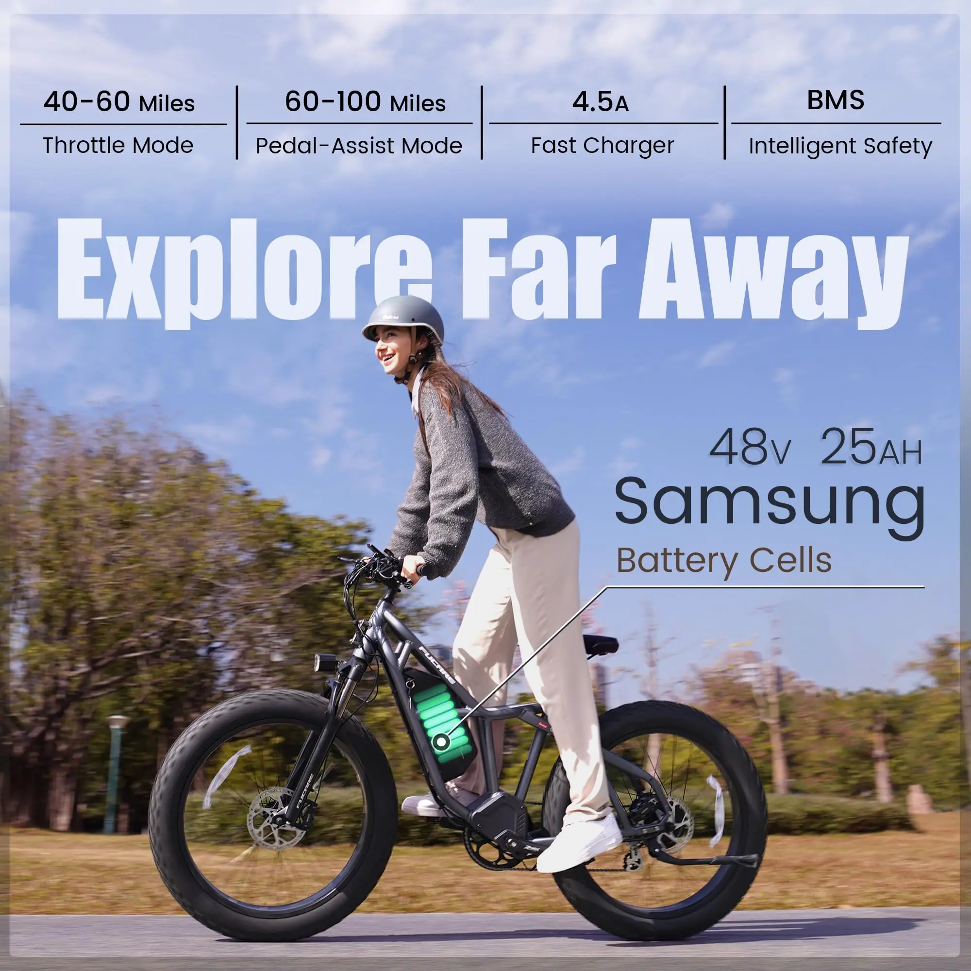 • Long-Range Battery: The 48V 25AH battery ensures a reliable and extended range, allowing you to explore further without worrying about running out of power.
