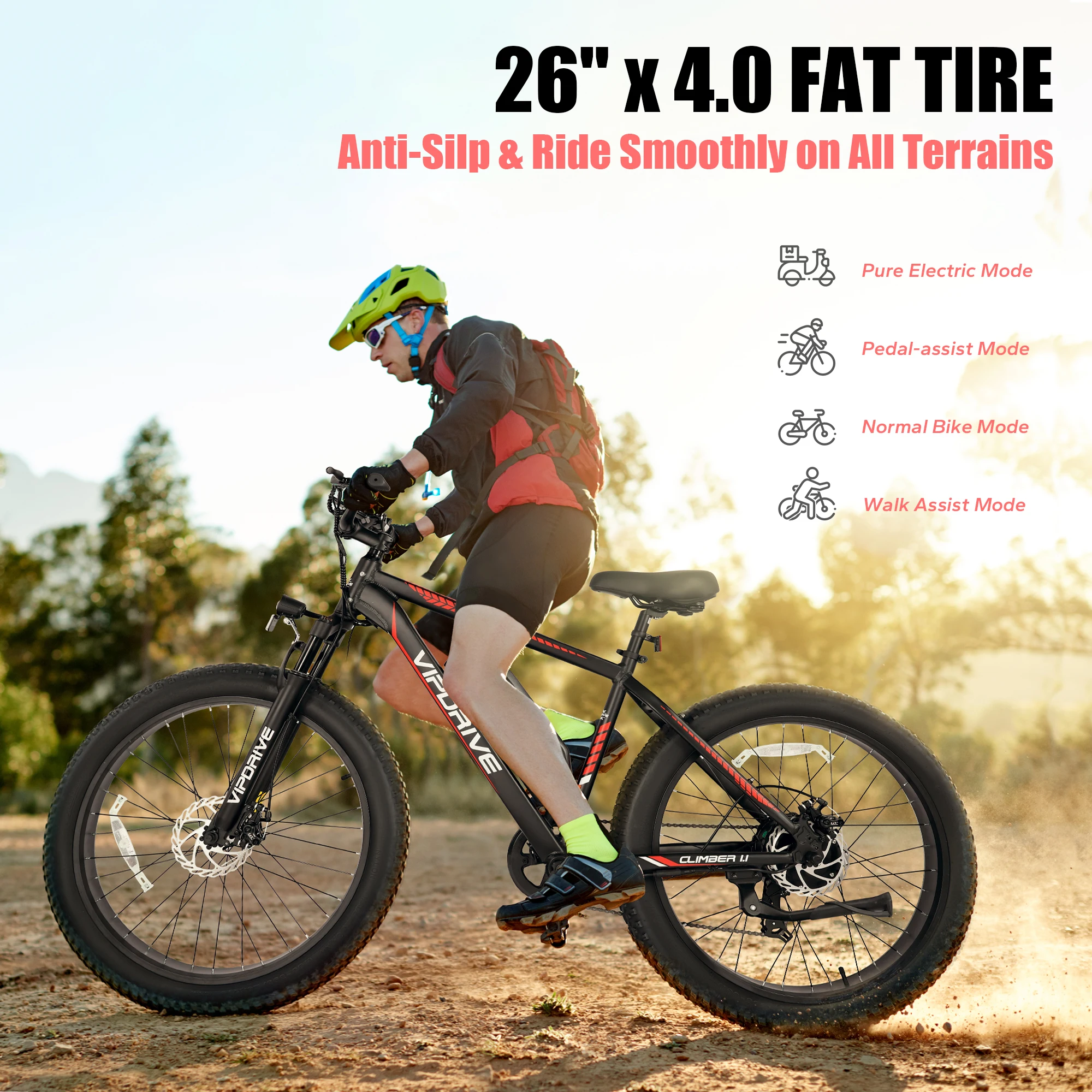 Equipped with 26-inch fat tires, the VIPDRIVE ebike offers superior traction and stability on various surfaces, from smooth roads to rugged trails. The multi-mode system allows you to switch between different riding modes, including pedal-assist and throttle-only, giving you the flexibility to customize your ride based on your preferences and conditions.