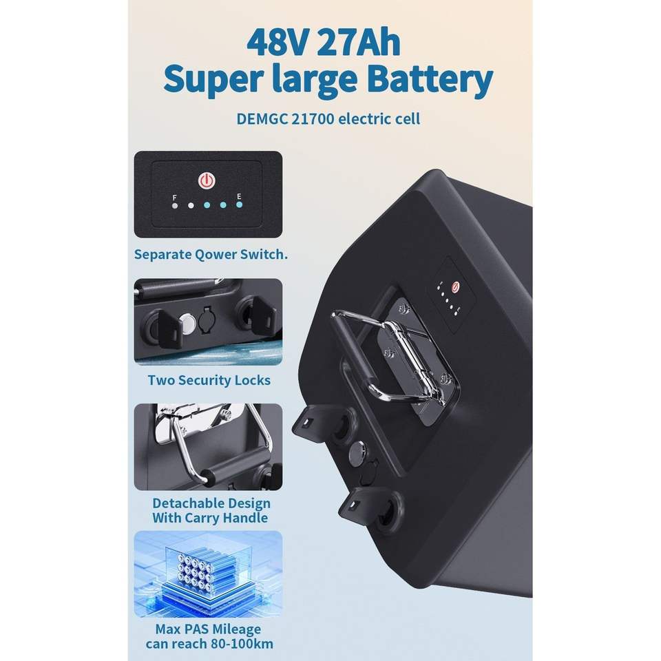 - High-Capacity Battery: The 1296Wh battery ensures long-lasting power for extended rides without the need for frequent recharging.