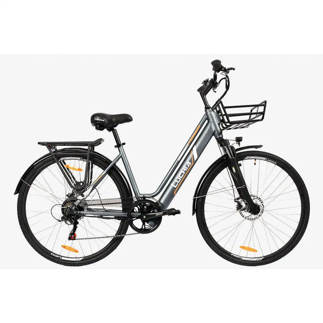 Erleben Sie jeden Tag etwas Neues auf Ihrer Reise. Die City Collection von Luchia wurde mit Fokus auf Bewegung, Balance, Komfort und Effizienz entwickelt. Das Modell Antares besticht durch fortschrittliche Ergonomie und erhält Bestnoten für sein innovatives Core-Skin-Design. Der doppelt verstärkte Aluminiumrahmen und die sorgfältig verarbeiteten Komponenten sorgen für eine nahtlose Integration und machen das Fahrrad sicherer, leichter und präzise verarbeitet. Verlassen Sie sich auf Zuverlässigkeit und Sicherheit dank des Scheibenbremssystems mit fortschrittlicher kombinierter Bremstechnologie. Dieses umweltfreundliche und komfortable Fahrrad ist ebenso praktisch wie vielseitig. Ausgestattet mit einem Frontkorb und einem Gepäckträger aus Aluminium mit zusätzlichen Befestigungsgurten bietet es ausreichend Platz für alles, was Sie auf Ihrer Reise benötigen. Highlights: Elektromotor 36 V 250 W, Vorder- und Rücklicht, Shimano 6-Gang-Schaltung, Scheibenbremsen vorne und hinten, Federgabel, Drehmomentsensor. Fahrradmerkmale: Abmessungen 1800 x 680 x 1100 mm, Gewicht 26,5 kg, Höchstgeschwindigkeit 24,9 km/h, 36V 10A Lithium-Ionen-Akku, maximale Zuladung 120 kg, Reifen 700C x 38C, Ladegerät 42V 2A, Ladezeit 5–6 Stunden, LCD-Display, LED-Scheinwerfer, LED-Rücklicht, höhenverstellbarer Sattel Gama Royale. Verfügbare Farbe: Grau.