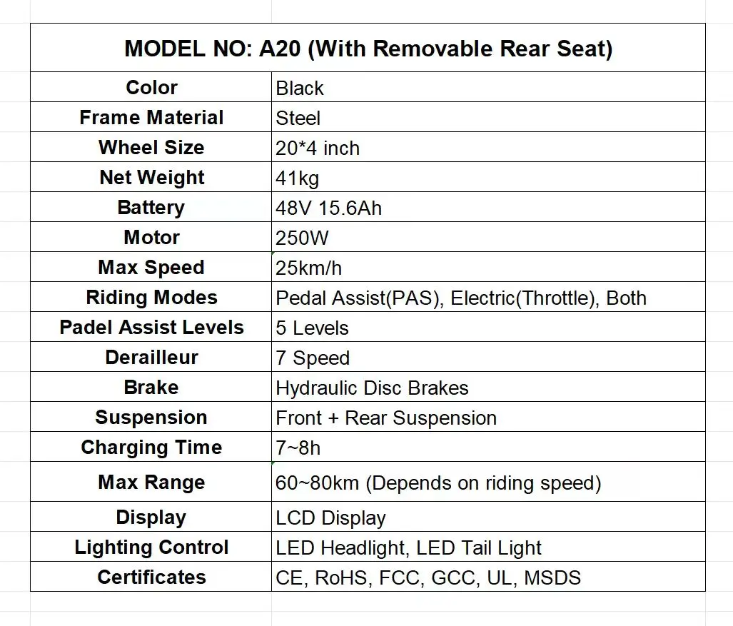 Das TYATDIM OEM A20 Pro 20 Zoll *4.0 Fatbike-Elektro-Mountainbike mit 250-W-Motor, 48-V-15,6-Ah-Akku und Doppelsitz ist mit einem bürstenlosen 250-W-Motor ausgestattet und entspricht den EU-Normen. Es erreicht eine Höchstgeschwindigkeit von 25 km/h, verfügt über 7 Gänge und bewältigt Steigungen von bis zu 45° mühelos.